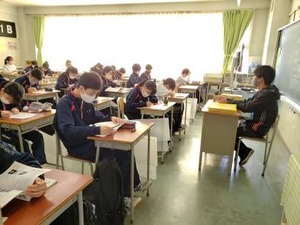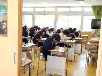 今日のラストは美術です。写真は上段から3年生→2年生→1年生の順です。1年生は長めの学活ですが、前半は明日に向けての自習タイムとなっています。自習タイムと言いながらも、試験の時と同様に、いい意味での緊張感を持って黙々と学習に取り組んでいました。写真を比較してご覧いただいても試験中のような様子が見られます。