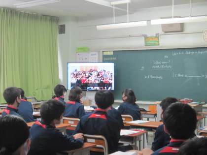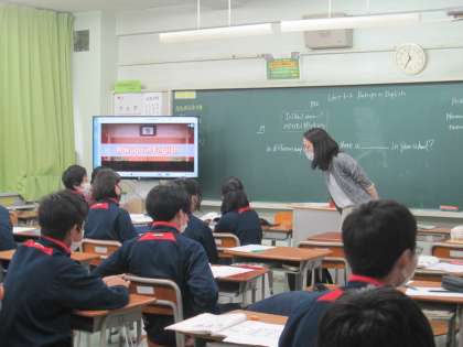 2年生がデジタル教科書の「英語で落語」を視聴していました。オチの部分では笑いも出ていてリスニング力にも感心しました。(副校長)