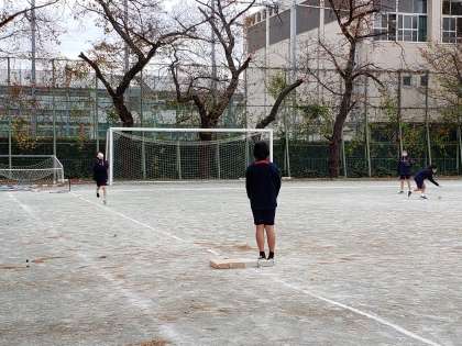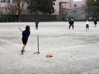 1年生女子の体育はTボール。ソフトボールとの違いはボールをバーに固定した上で打つところです。静止しているボールを打つのも意外と難しいようです。それでもクリーンヒットが飛び出すと嬉しそうです。