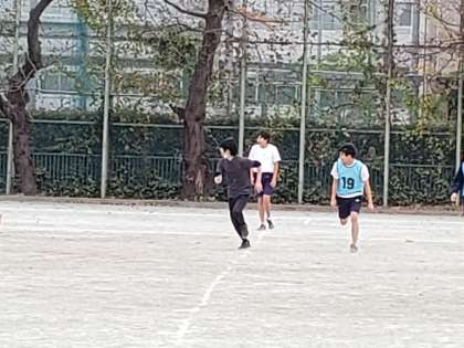 れっきとした体育の授業です。3年生の体育サッカーを職員室から眺めていた学級担任が、居ても立ってもいられずに飛び込みで試合に加わりました。サッカー経験者の学級担任、ボールをキープする場面も多く見られました。