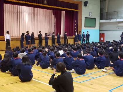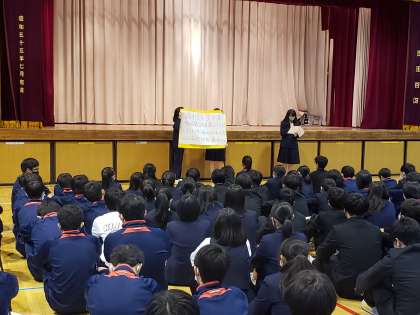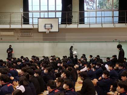 3年生の学年朝礼。全て段取りから進行まで生徒が中心となって行います。学年委員会のメンバー紹介の後、委員会で決めた残り4ヶ月のスローガン「努力すべし、人として当たり前のことをすべし、人に配慮すべし」が披露されました。学校の自治活動の中心は現在2年生が担っていますが、これまで砧中学校をリードしてきた3年生のプライドが伝わってきました。