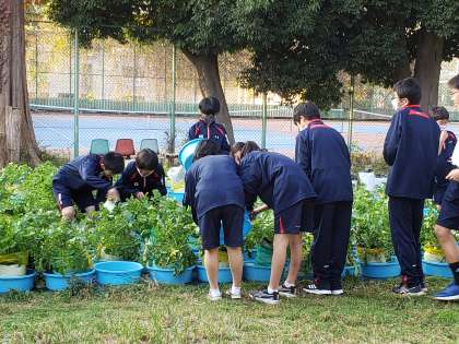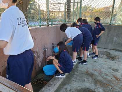 1年生の技術の大根栽培。葉も繁り、かなり成長してきました。作業も楽しそうです。ゆったりとした時間が流れていますが、こんな6校時もいいですね。