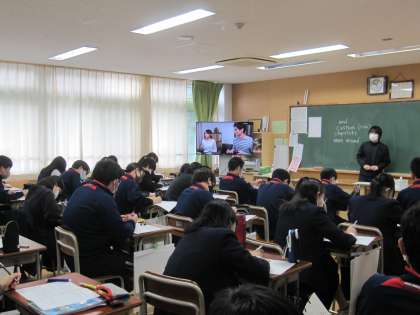 3年生の英語でテーブルマナーを話題にしたビデオを視聴しました。教科「日本語」や家庭科でも学んだマナーを日本語で挙げた後、英語ではどのように表現するのか、一緒に考えました。