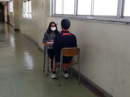 1年生英語、ALTの先生と英語で面接。さぞかし緊張しているだろうと思ったのですが、堂々と受け答えできていました。面接後「Good job!」と伝えると笑顔が返ってきました。