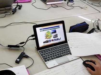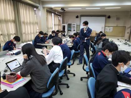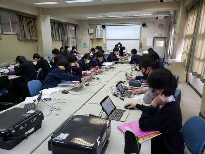 2年生英語では「東京の町紹介」を計画中。まずは自分で町を選び、パソコンで調べています。最終的にはプレゼンテーションまで考えているとのこと。調べた内容をどう英語に訳していくのかが大切なポイントです。