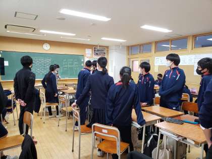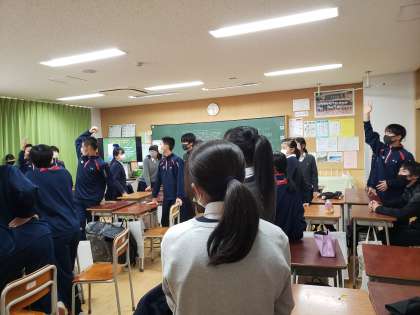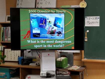 3年生英語は、班対抗ジャンル別クイズ合戦です。ジャンルと得点を選択して答えを競い合います。先生たちも入って大盛り上がりでした。進路面談前の不安な時期ではありますが、3年生の笑顔にホッとした時間となりました。