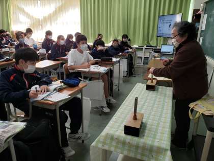 1年生理科、音の伝わり方について。一方の音叉を叩くともう一方の音叉に音がどう伝わるかを調べます。叩いた後にその音叉を手で握っても、もう一方の音叉の音が響きます。「共振」ですね。生徒たちから「おぉ〜」と歓声が上がりました。