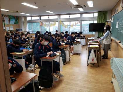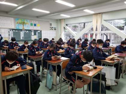 今朝の朝読書風景です。この10分間は校舎内が静寂に包まれます。今、ちょうど3年生徒と校長・副校長との間で面接練習が行われている時期です。その中で砧中の強みとして、学ぶべき時と遊ぶ時との切り替えの早さを挙げる生徒が多くいます。まさにそれが自己評価でもあり、砧中のアピールポイントでもあるのでしょう。