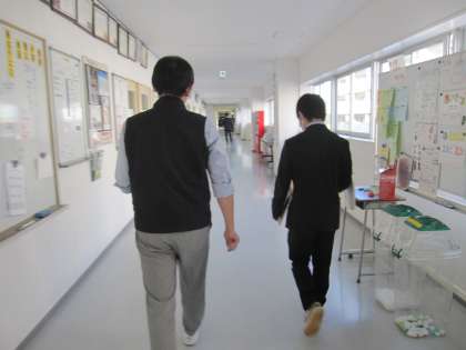 若手の教員が各クラスのメインで指導を行う中、ベテラン教員が後ろから様子を見守っていました。(副校長)