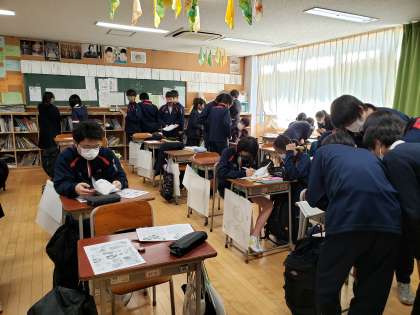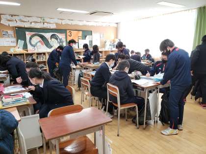 3年生英語、隣同士の学級で同じ取り組みをしていました。