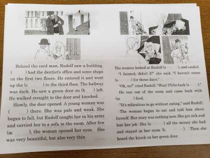 一つの物語をグループごとに分割します。それぞれ分割したパートには空欄があります。その空欄をグループて話し合い、より適切な表現として完成させ、最後は全ての物語を繋げて発表します。