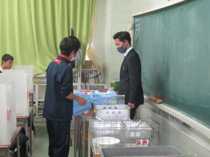給食委員長が各クラスのカゴのセットの仕方をチェックして回りました。