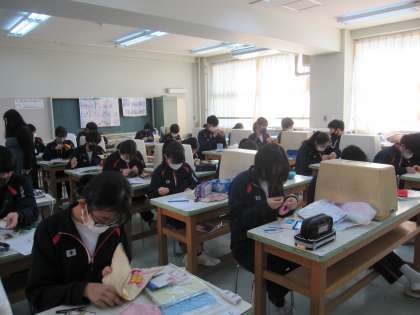 この授業を通して、手作りの大変さを実感し、物を大切にする気持ちも芽生えたのではないでしょうか。出来上がった作品は3学期に展示します。(副校長)