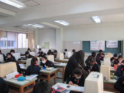 3時間で作れる幼児のおもちゃということでスタートした授業ですが、予想以上に針作業に時間がかかっています。今日は、完成した生徒はポケットティッシュ入れや時期に合った小物作りを行い、未完成の生徒は急ピッチで作業を進めていました。