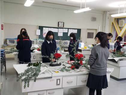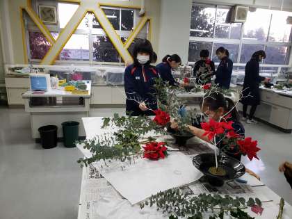 放課後の部活動。日本文化部は生け花に取り組んでいました。いつも活動場所として使っている調理室がユーカリの香りに包まれています。指導はもちろん副校長先生です。明日以降、年末の校舎内を素敵な花々が彩ることでしょう。