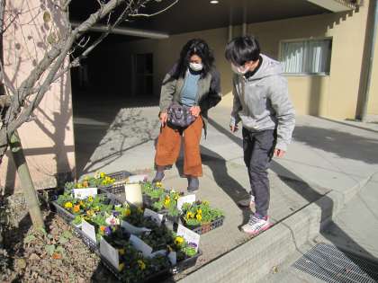 下の写真はI組の生徒が育てたパンジーを支援員が確認しているところです。