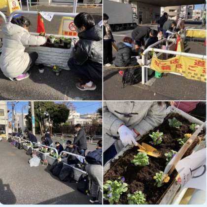 学校で手塩をかけて、育てたパンジーなどを、喜多見北部町内会の皆様のお力も借りながら取り組むことができました。