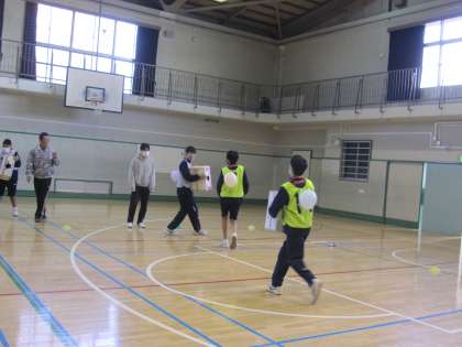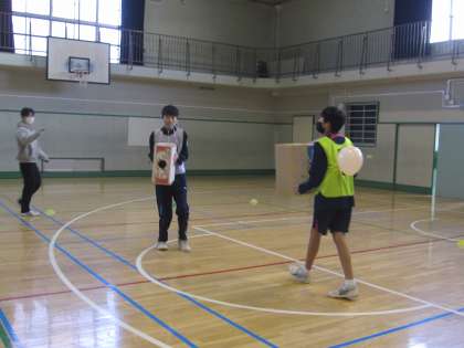 段ボールの穴から急激に空気が押し出されるときに空気の塊が勢いよく飛び出します。その、空気の勢いを利用して、相手の背中に磁石で付けた風船を落とすゲームです。ある生徒が「とっても楽しいです。」と感想を聞かせてくれました。