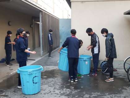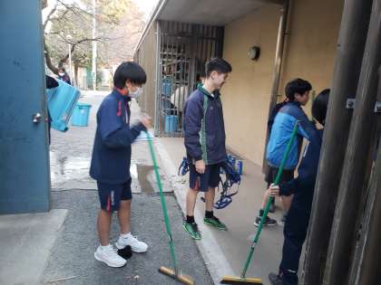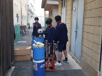 美化デーに先駆けて、運動部員たちが体育倉庫の大掃除に取りかかりました。夕方で少し気温が下がっていますが、楽しそうな雰囲気でした。年の瀬を感じる光景です。