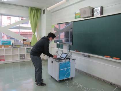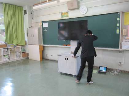 始業式はリモートで行うため、各教室で接続状態の確認を行っています。(副校長)