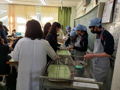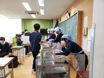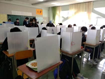 新年最初の給食はハヤシライスでした。カレーライスと並ぶ人気メニューです。大盛りのお皿にニンマリの生徒の姿も。パーテーションでの感染症防止、さらに徹底しています。