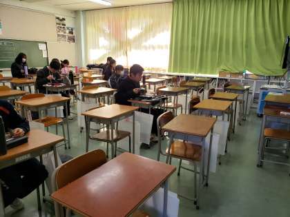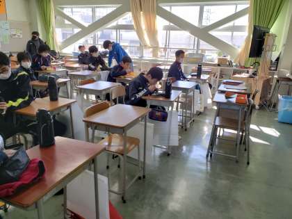 土曜日はお弁当持参の生徒もいます。お弁当の時間も感染症予防への配慮が必要との教職員からの意見もあり、これまで一つの教室でまとまって食べていた点を見直しました。今日のお弁当からは教室を分散して、生徒間も一定の距離をとってもらうことにしました。