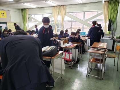 1年生の教室を回ってみました。どの学級でも朝読書前の健康観察を入念に行っています。学級担任は生徒一人ひとりの健康観察表をチェックし、気になる場合は保健室とすぐに連携がとれる体制にしています。これまで朝読書の時間には、学級担任も一緒に本を読んでいましたが、今年度は健康観察表のチェックに費やされます。今日一日を安心・安全に過ごすために、健康観察は朝の重要なルーチンとなっています。