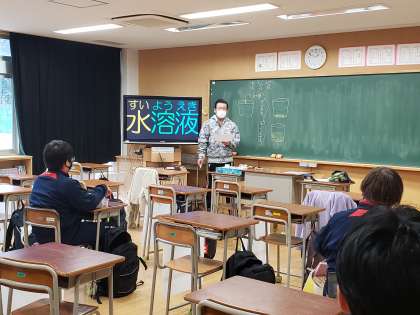 I組では1年生が理科に取り組んでいました。今日は水溶液を使っての実験を行います。生徒には一人ずつビーカーと液体が配られました。さぁ水には何が溶けているでしょうか。