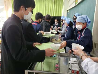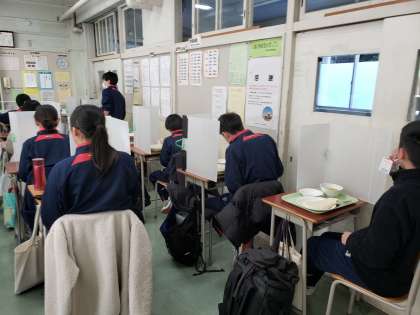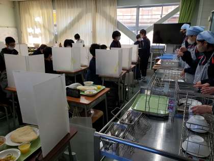 そんな過去の恥ずかしい出来事を思い出しながら、2年生の教室にお邪魔しました。さすがにそんな食べ方の生徒はいませんよね。みんなスマートに給食を楽しんでいました。