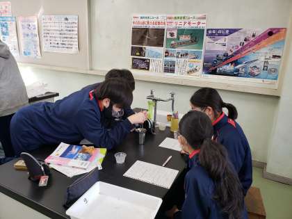 理科室では2年生が実験中。「露点の測定」を行っていました。コップについた水滴を慎重に観察しています。