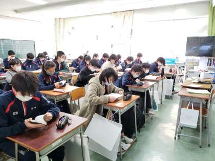 砧中学校では毎朝10分間の朝読書タイムを設けています。読書習慣と授業への気持ちの切り替えが大きな目的です。読む本は生徒の好みに応じて選んでいます(3年生は自習もできます)。