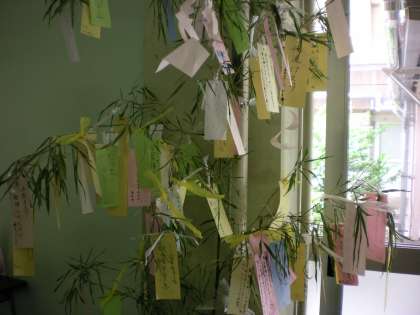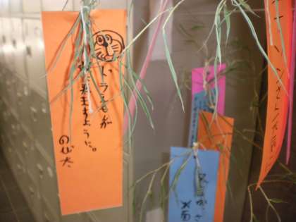 砧中では、主事さんが笹の木、短冊、筆記用具などを用意してくださいました。