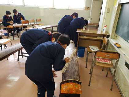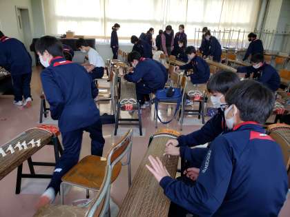 3学期から音楽では和楽器に取り組みます。実際に筝に触れることで、その音色の美しさを実感します。生徒たち、興味津々のようです。少しずつ演奏に向けて練習ですね。