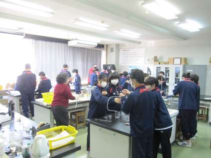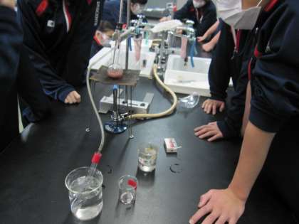 1年生の理科では、ガスバーナーを使ったワインの蒸溜の実験を行いました。1学期に少人数で学習したガスバーナーの取り扱い方を思い出しながら操作をしていました。(副校長)