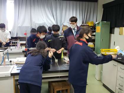 1年生理科、赤ワインを蒸留しています。さてどんな液体が抽出されるでしょう。ALTのジェシー先生もお手伝いに入っています。ちなみに実験は英語でexperiment、理科室や実験室はlaboratoryです。よく略して「ラボ」って言いますよね。