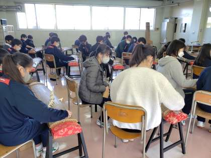 2年生音楽、筝の演奏。2年生は昨年度も経験しているため、早速本格的に演奏に入っています。学校では「生田流」を学んでいます。座り方にも作法があり、左斜め45度の姿勢をとりました。弾き方も経験済みで堂々としていました。