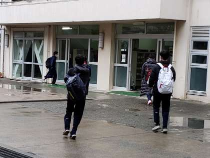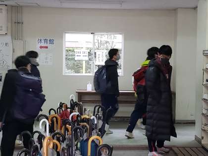 雨の日は混雑しがちな昇降口ですが、密を避けるため副担任が上手に誘導していました。