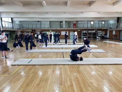 男子はマット運動です。得意不得意が分かれる種目ですが、体が柔軟な中学生の時期だからこそ、しっかりと取り組んでおくことが大切ですね。
