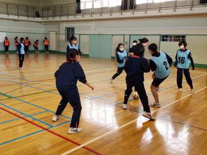 女子はミニサッカーでした。校庭のサッカーと比べてスペースが狭い分、俊敏な動きが見られました。ボールも一回り小さいものを使います。