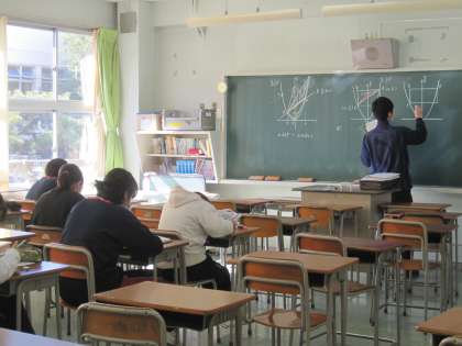 3年生は問題演習が多くなっています。解説が必要な内容は、図を描いて説明するのが一番です。フリーハンドで描く放物線も生徒の手本になります。