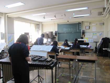 音楽は「花咲ク街」の合奏をしています。春を待つこの季節にぴったりの曲ですね。周りの音を聞きながら合わせていこうとする姿がありました。ずいぶん仕上がってきました。