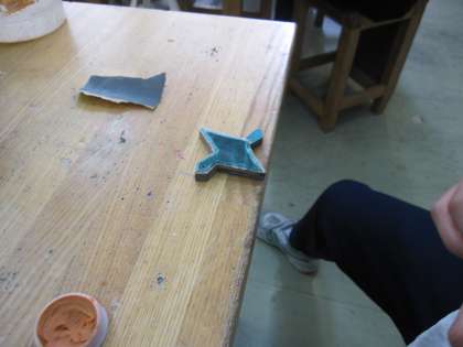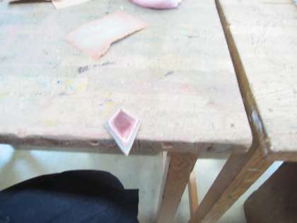色の違う木が何層にも重ねられた材料を自分の好きな形にカットし、ひたすら磨きます。ペンダントやキーホルダーになります。