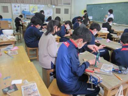 2年生の美術の授業 木目堆朱(もくめついしゅ)