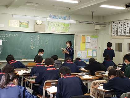 2年生国語は漢文の音読テスト。一人ひとり教卓の前で音読を披露します。日常会話では使わない表現ですが、相当勉強してきたようで、どの生徒もスラスラと音読していました。