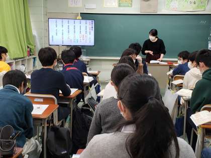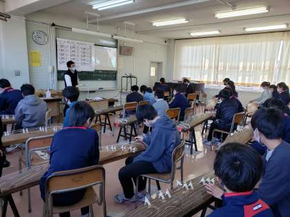 1年生音楽では引き続き箏を練習しています。初めての学習時と比べて格段に上達してきたようです。指の使い方も自然体となってきました。廊下に出てみると、生徒たちが奏でる箏の音が、春を感じさせてくれました。