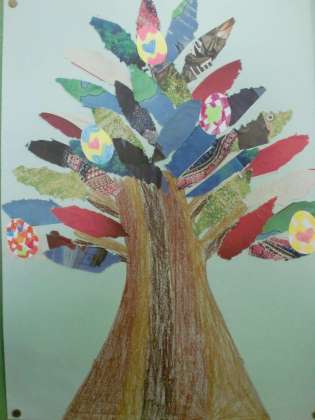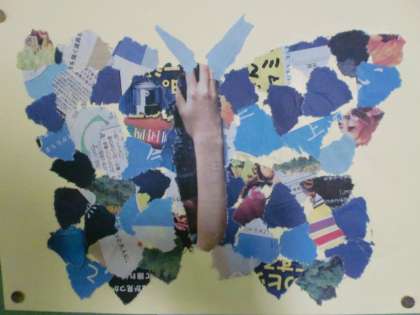 美術では新聞紙のちぎり絵を作成しています。初めは新聞紙をちぎるのに苦労していましたが、枚数をこなすうちに上手にちぎれるようになりました。新聞紙のカラー刷りのお気に入りの広告を選んでちぎり、台紙に貼りました。カラフルな蝶や木ができあがりました。南校舎1階の廊下に展示してありますのでご覧ください。