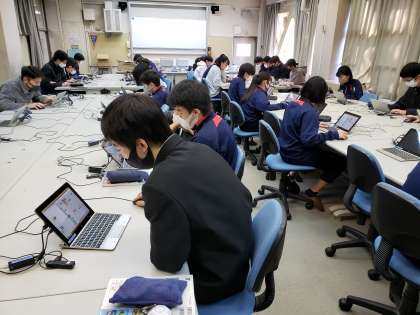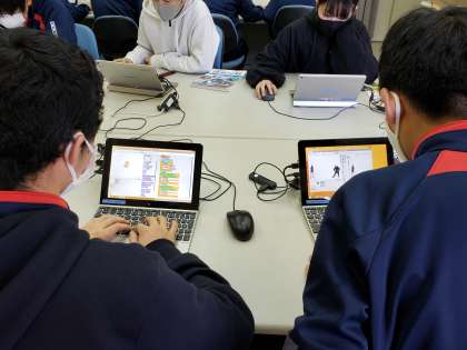2年生技術はプログラミング。オリジナルのクイズを創作中です。様々なキャラクターも登場させたりしながら、楽しいクイズを模索しています。