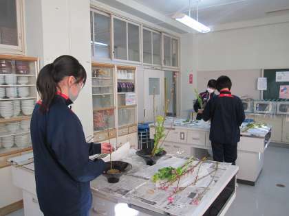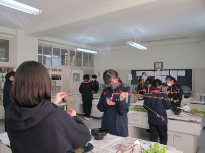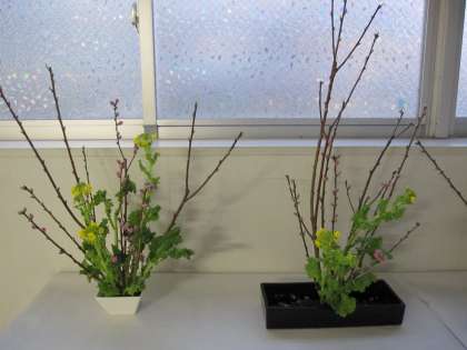 今月の日本文化部の生け花の花材は桃と菜の花です。一足先に桃の節句を思わせる取り合わせです。生徒たちは桃の太い枝を切るのに苦労していました。枝をためて(曲げて)しなやかな雰囲気を表現した作品もあります。
