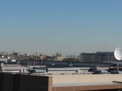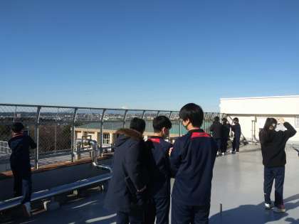 安全確保の為、はしゃぎすぎない・フェンスに登らない・近隣の方々へ気を配って行動するなどを確認した後、遠くまで見渡せる晴天の日を選び屋上へ。富士山や、その前を横切る丹沢連峰・箱根。北東方向の新宿高層ビル群や浅草押上のスカイツリーまではっきりと見通せました。安全対策のため、緊急時などの特別な事情がなければ普段は自由に出入りできない屋上。今回は体験的な授業実践として手続きを行い、この授業が実現することになりました。