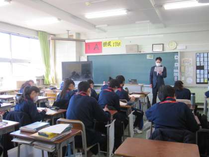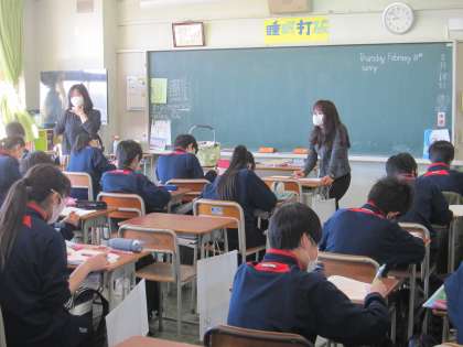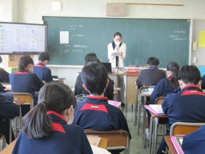 毎回のビンゴでは、知っている単語の数を増やす効果もありますが、単語を聞き取る能力も鍛えられます。生徒は教師の発音聞き漏らすまいと集中しています。1年生も授業のペースが身につき、英会話を楽しむところ、文の構成を学ぶところなどそれぞれに主体的に取り組んでいます。(副校長)